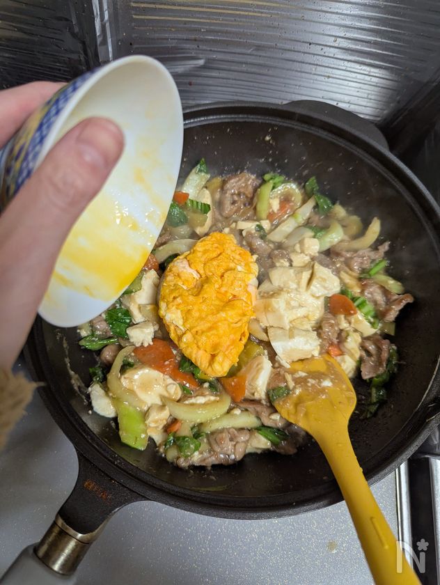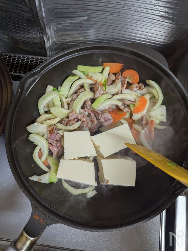 豆腐は混ぜると崩れやすいため、最初は大きめに切って加えるのがおすすめです。