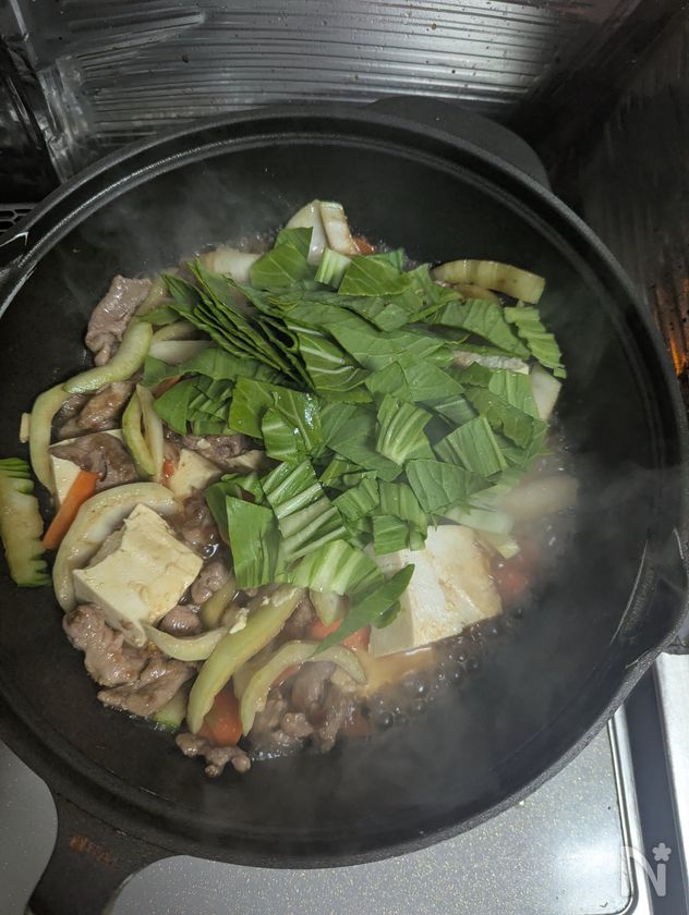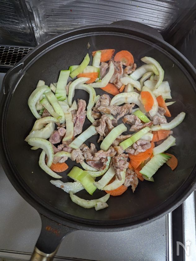 (5) 片面に焼き色がついたらチンゲン菜の根元とにんじんを入れ、混ぜる。蓋を閉めて弱火で4分蒸し焼きにする。
