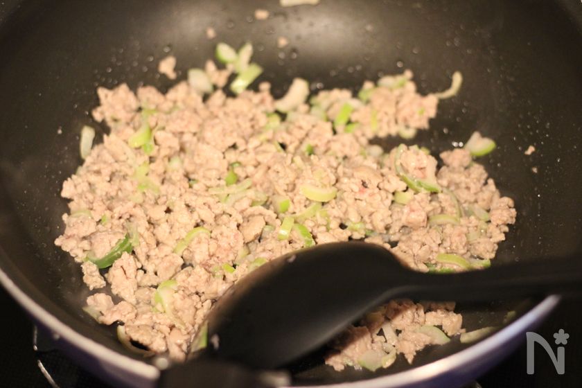 フライパンに豚ひき肉、長ねぎ、おろしにんにくとおろし生姜を入れて炒める。