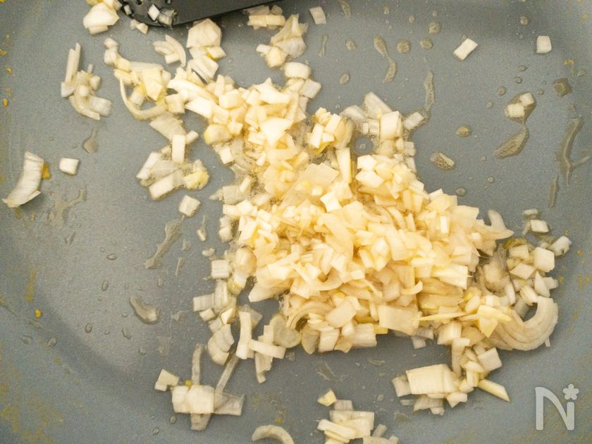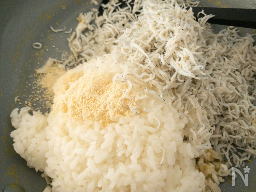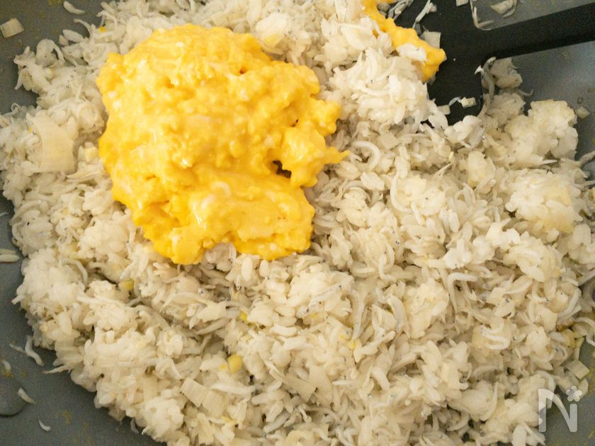 (3) ご飯・しらす・鶏がらスープの素を加え、強火で1分程炒める。