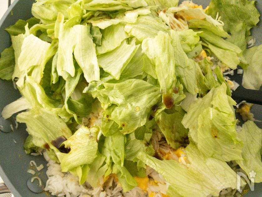 (5) レタスを加え、【B】をまわしかけたら、強火で1分程さっくり混ぜ炒める。