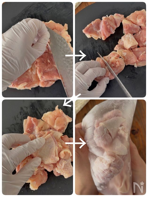 (1) 鶏もも肉は余分な脂を切り落とし、大き目の1口大に切って塩を振り揉み込み、ポリ袋に入れて片栗粉を加えて振り、まんべんなく衣をつける。