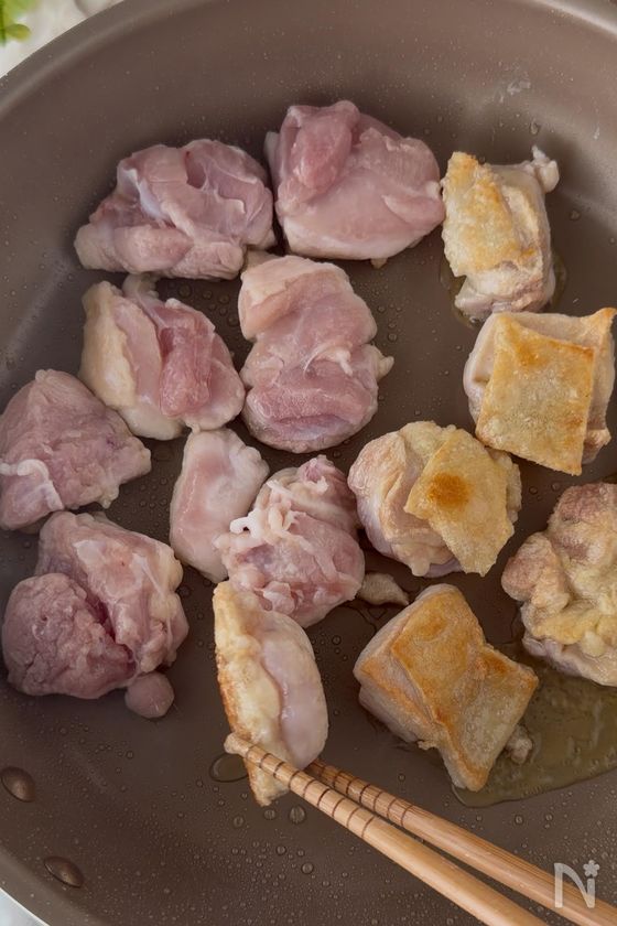(2) フライパンにサラダ油を入れ②を皮目を下にして並べ入れ、3分焼いて焼き目が付いたら裏返し蓋をして3分蒸し焼きする。