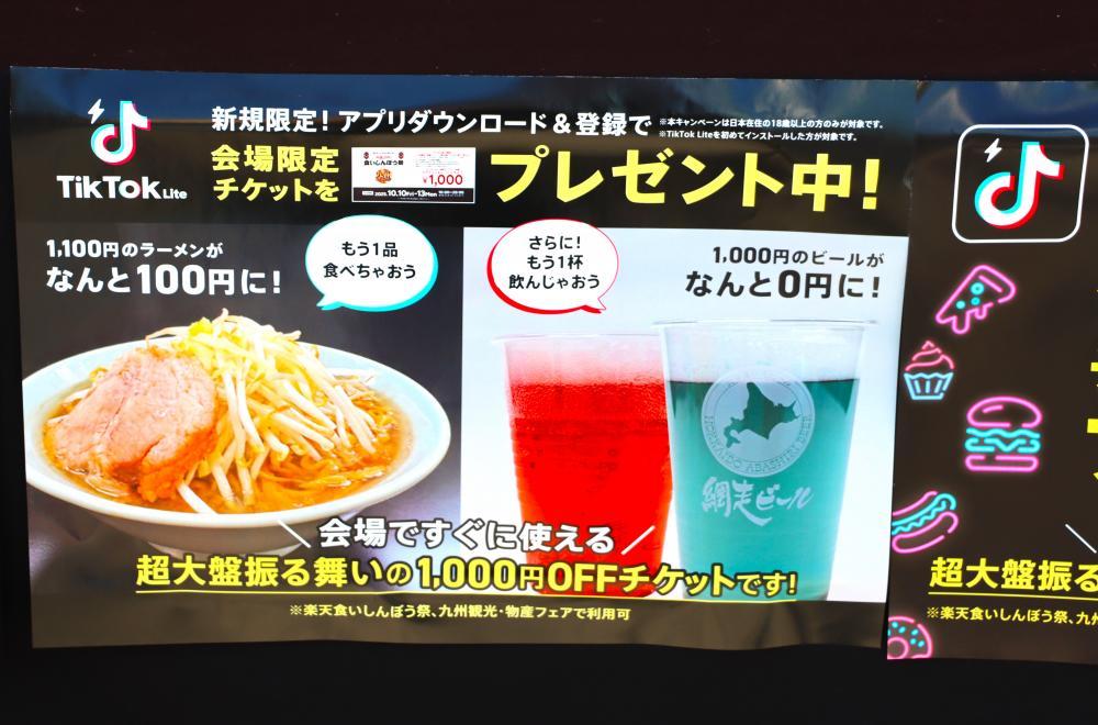 動画視聴がメインのTikTokの軽量版アプリ「TikTok Lite」のブースでは、新規アプリダウンロード&登録で、イベント会場で使える「1000円オフチケット」がもらえます。楽天食いしん坊祭、同時開催中の「九州観光・物産フェア」で利用できます。まだアプリをダウンロードしたことがない人は活用したいですね。