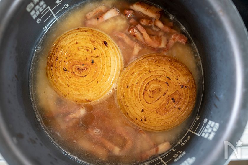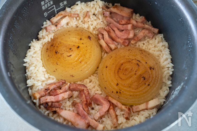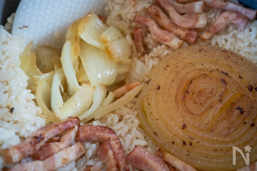 ごろっと丸ごと甘ウマ♪焼きたまねぎとベーコンの炊き込みごはん