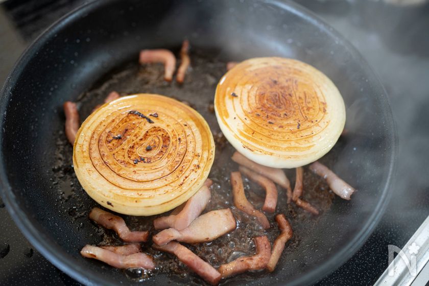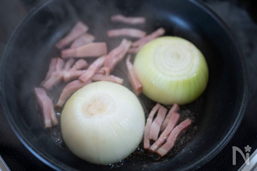 (1) フライパンにたまねぎの切った面を下に、ベーコン、バターを入れて玉ねぎにこんがり焼き目がつくまで加熱します。