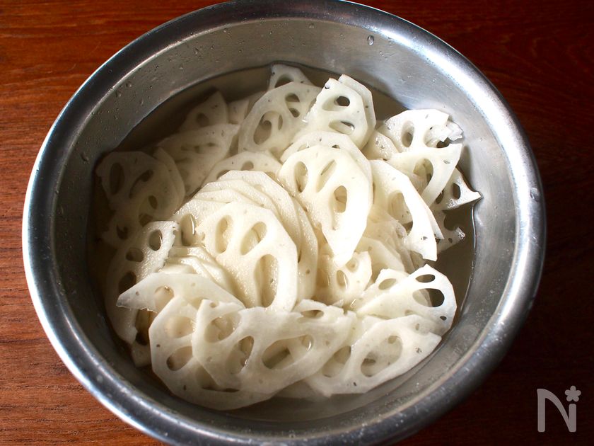 (2) れんこんは皮をむき、薄いいちょう切りか半月切りにし、水にさっとさらし、水けをしっかりきっておく。