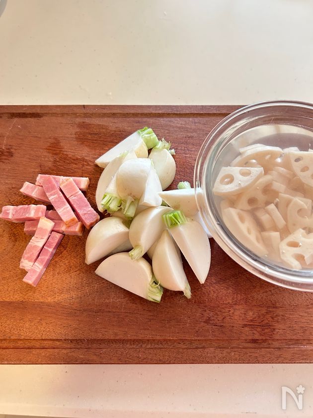 (1) 小かぶは皮ごとくし形切りにする。れんこんは7〜8mm幅のいちょう切りにし、酢水にさらす。ブロックベーコンは短冊切りにする。
