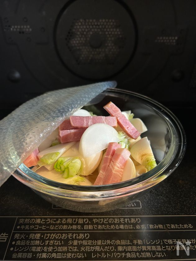 (2) 耐熱ボウルに1を入れてふんわりラップをし、電子レンジ(600W)で4分30秒〜5分間加熱する。余分な水分はキッチンペーパーで拭き取る。