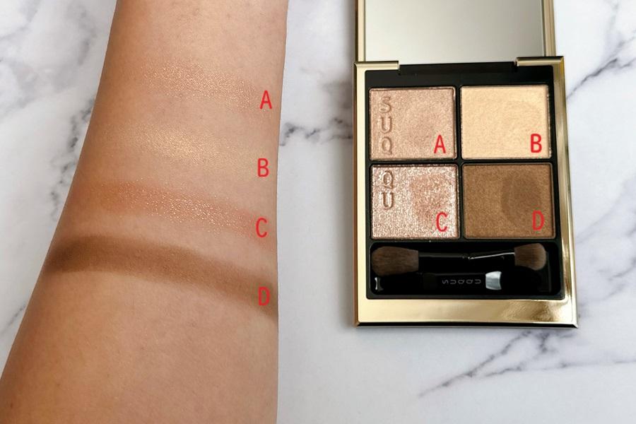 そして右下(D)は深みを感じる締め色ブラウン。パレットを見たときは「締め色だけど、ラメ感もあって輝きのある発色なのかな......」と思っていましたが、実際に肌にのせてみると、意外とマット感のある仕上がりに。