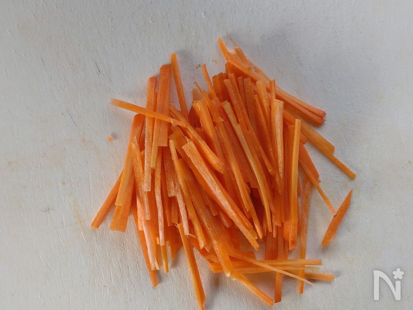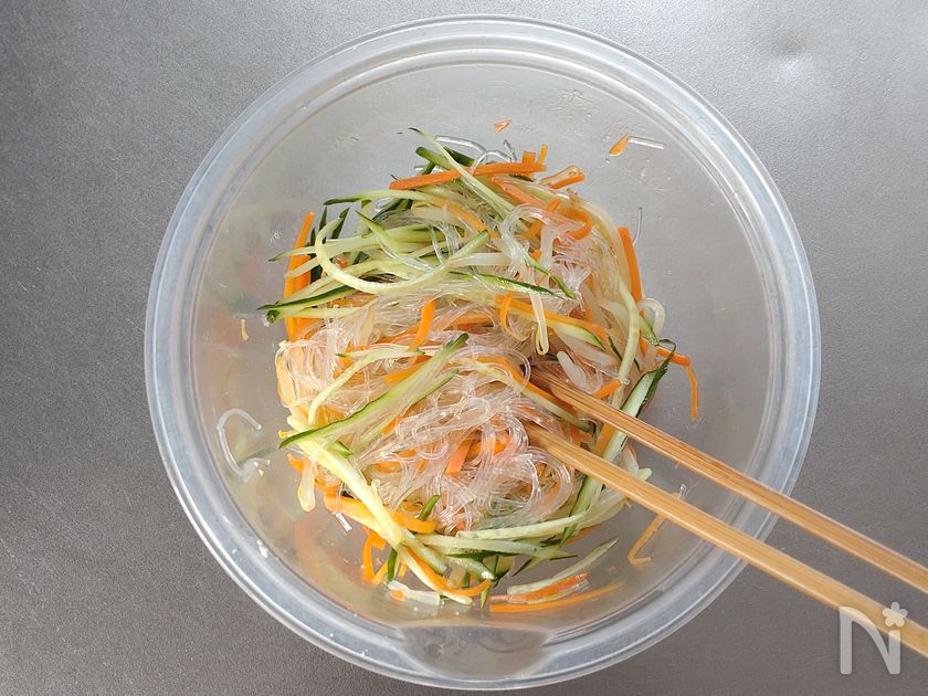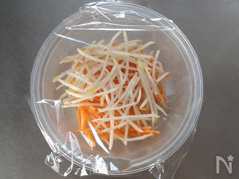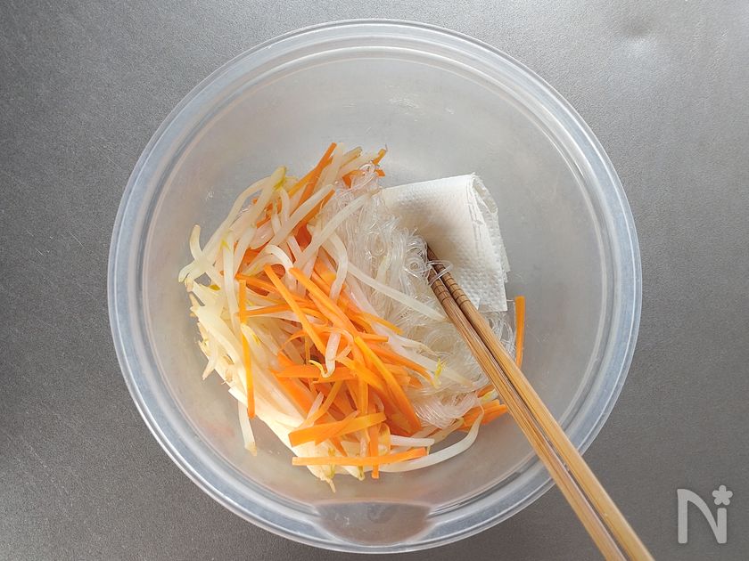 (2) 耐熱ボウル(又は深めの耐熱皿)に乾燥春雨、にんじん、もやし、水を入れてラップをし600wのレンジで2分半加熱する。加熱後5分ほどおく。