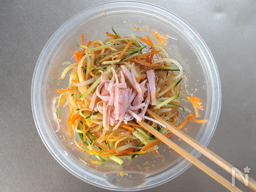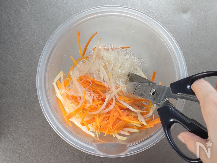 (5) 野菜を避けてキッチンバサミで春雨を食べやすく切る。