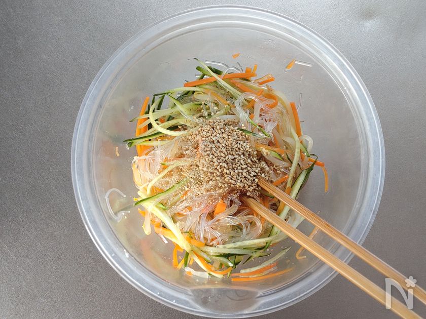 (7) 醤油、酢、鶏ガラスープの素、白すり胡麻、炒り白ごまを加えて混ぜる。