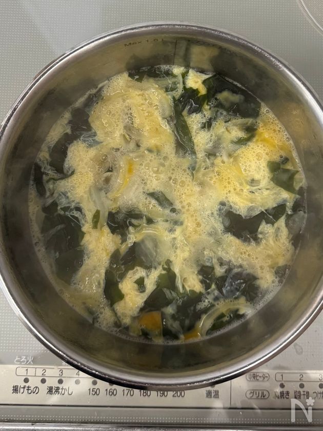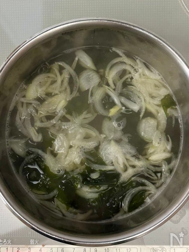 (1) 鍋に、【A】と乾燥わかめ、玉ねぎを入れ、中火にかける。沸騰したら、弱火で1~2分程煮る。