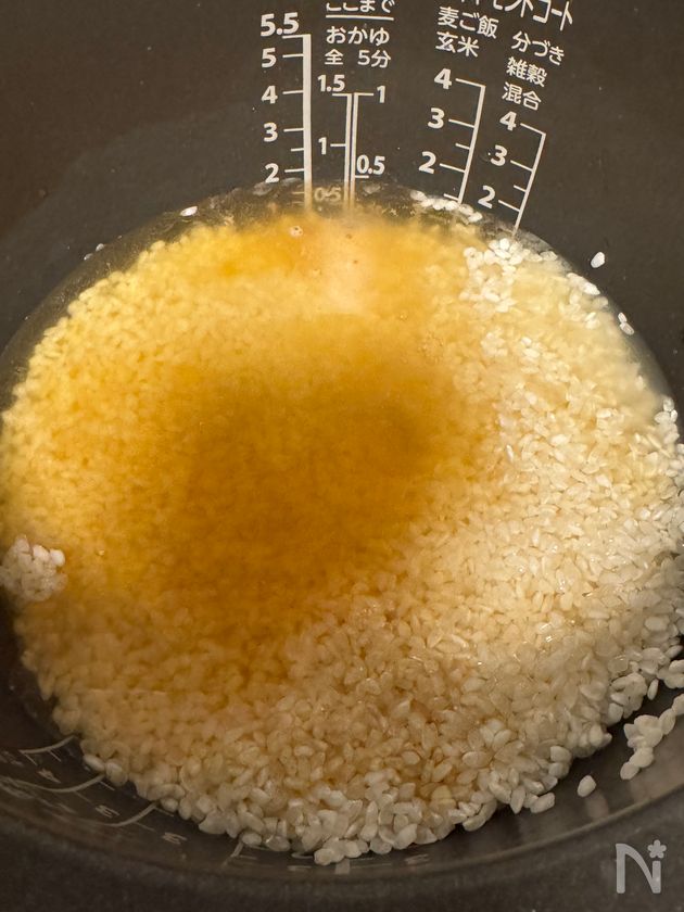 (2) 炊飯釜に洗った米と【A】を入れ、水を2合の目盛りより気持ち少なめに入れて混ぜる。