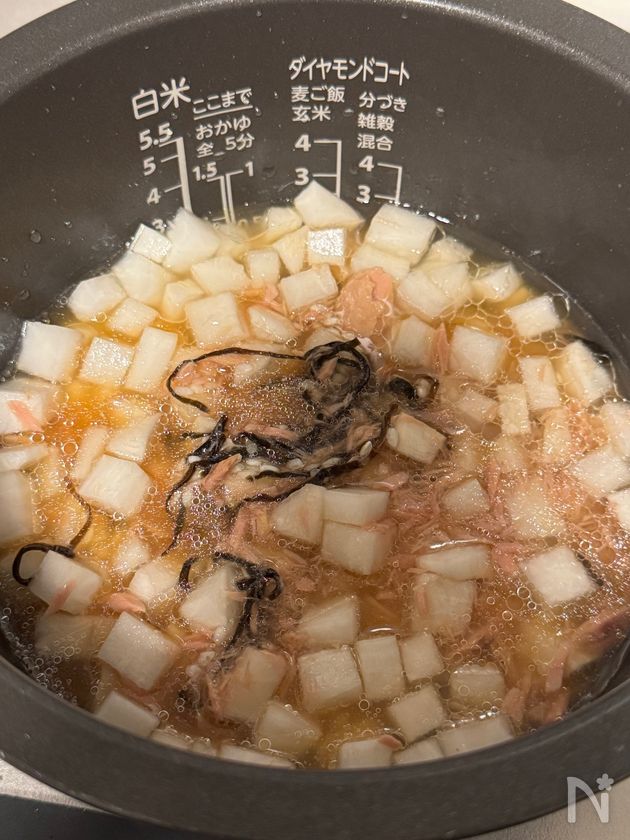 (3) 塩昆布とツナ缶(オイル缶)と、大根を入れて軽く混ぜ、普通炊飯したら完成です。