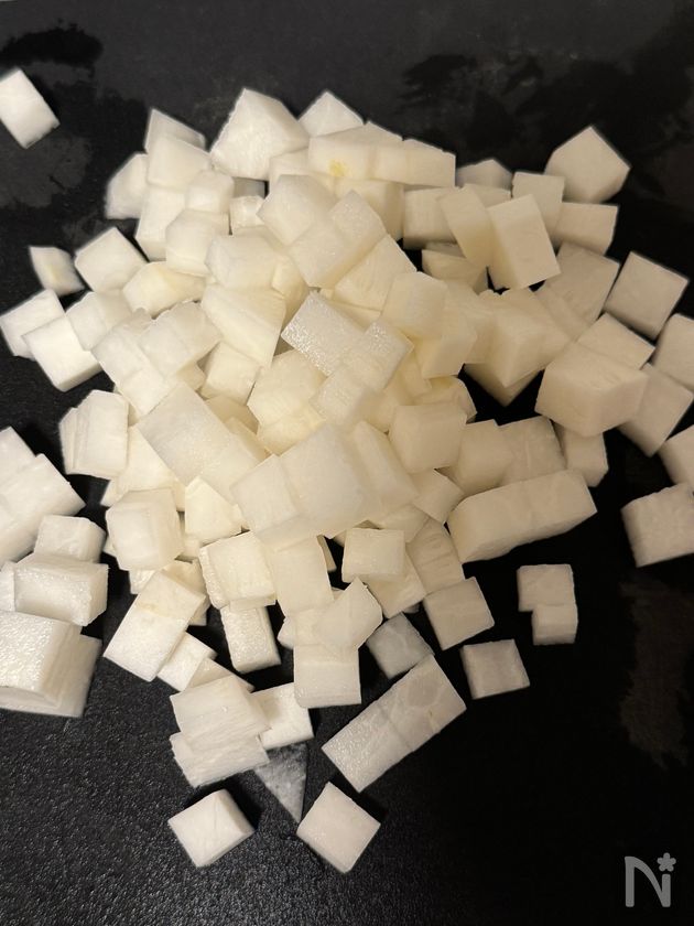 (1) 大根は1センチほどの角切りにする。