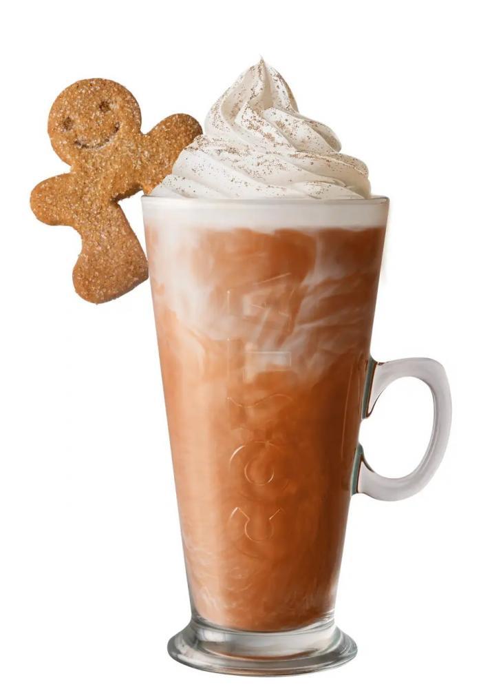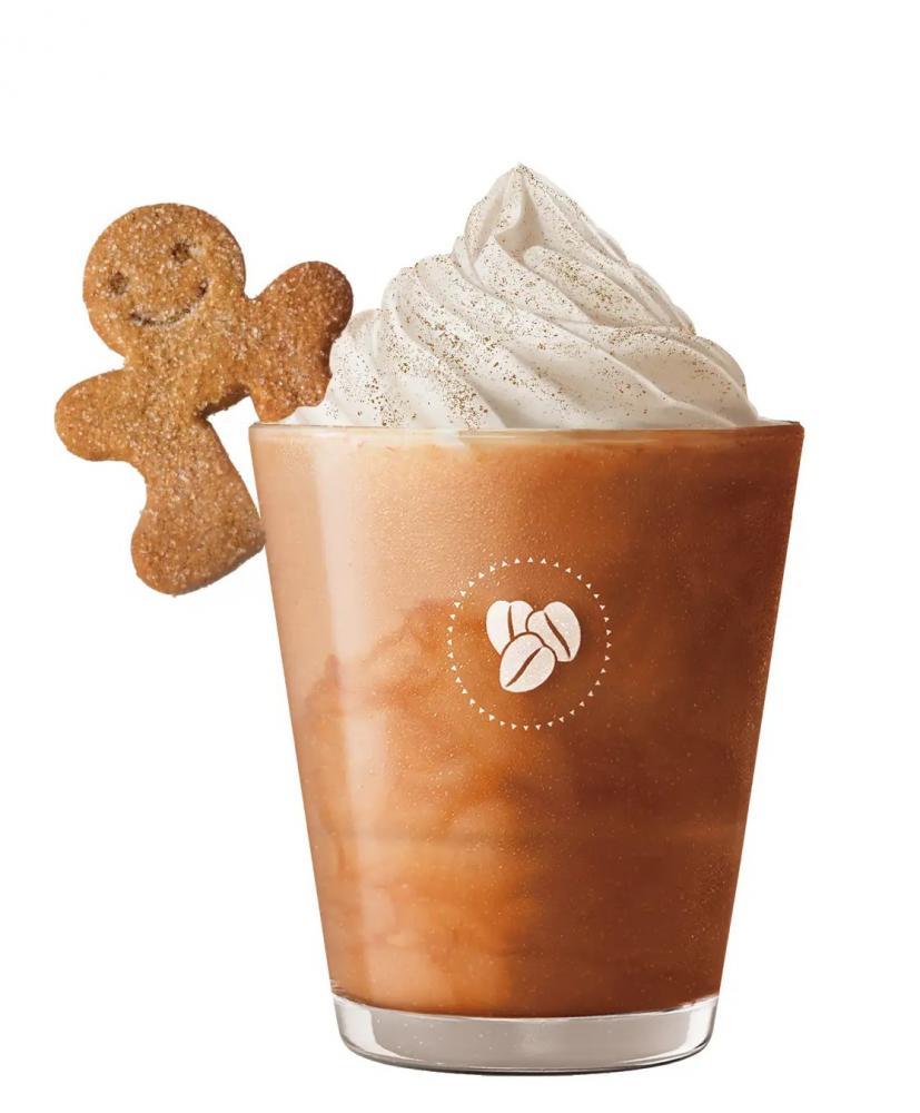 クリスマスの定番スイーツ"ジンジャーブレッド"をイメージしたラテに、ホイップクリームと可愛らしい「ジンジャーブレッドマンクッキー」をトッピング。仕上げにふりかけたシナモンパウダーが、味わいに深みをプラスしています。