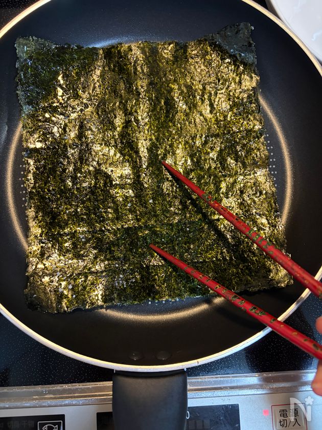 (4) 海苔のたわみがなくなり、表面がぺたんと平らになったらパリッと焼けたサイン。