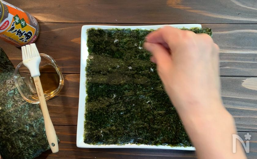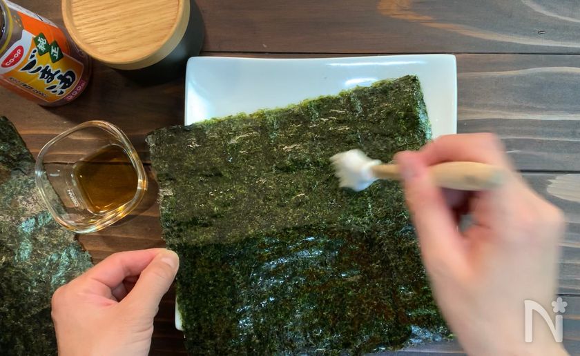 (1) 板のりのおもて側(つるつるした面)に刷毛でごま油を均一に薄く塗る。