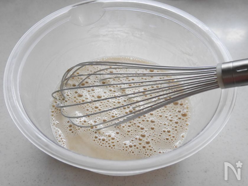(1) 卵を割りほぐし、黒蜜を混ぜ合わせたら、薄力粉を茶こしなどでふるい入れながらよく混ぜる。牛乳を少しずつ加え、よく混ぜる。