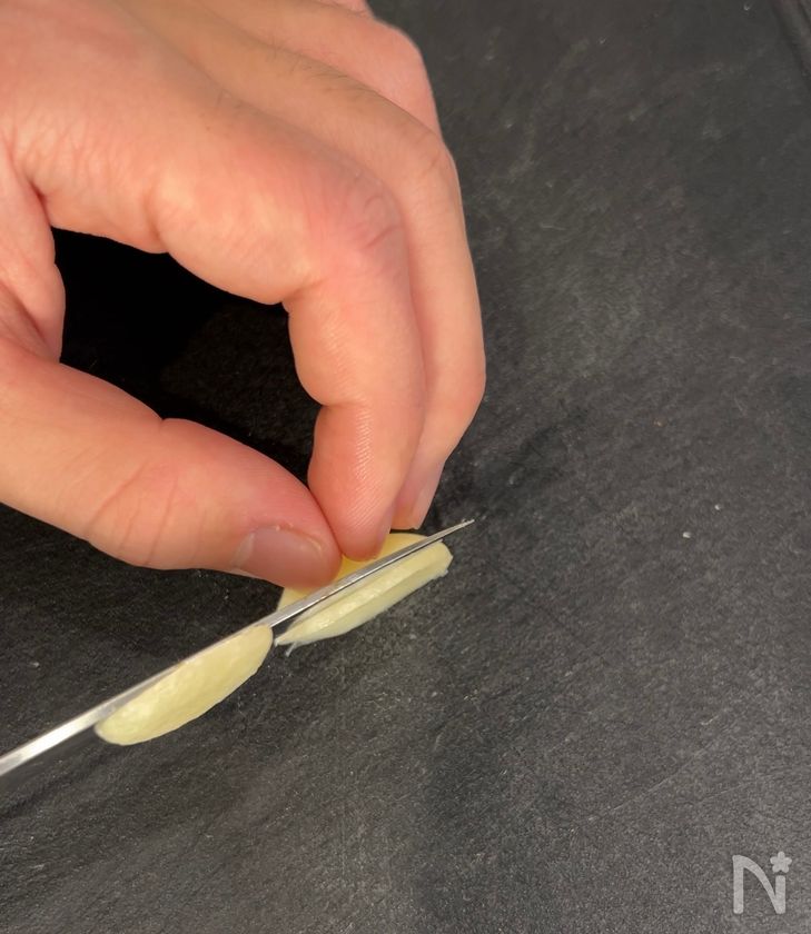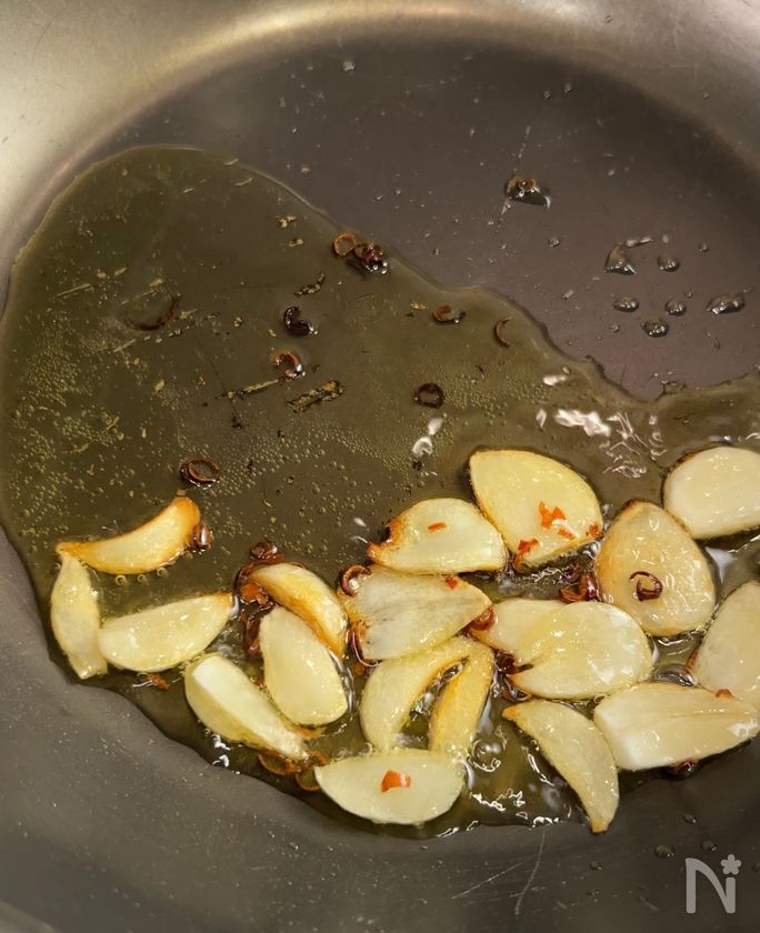 (1) フライパンにオリーブオイルをひき、にんにくと輪切り唐辛子を入れて、中火にかける。
