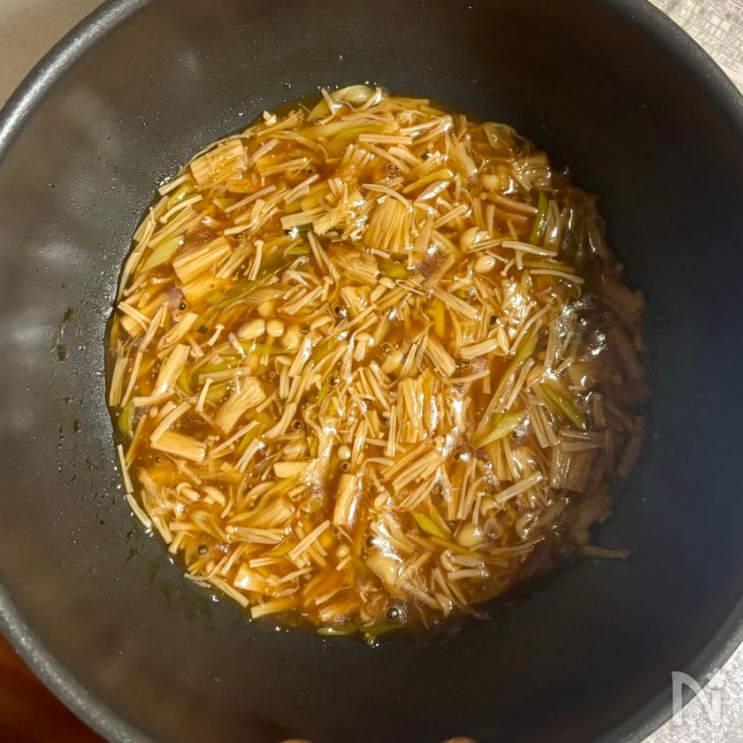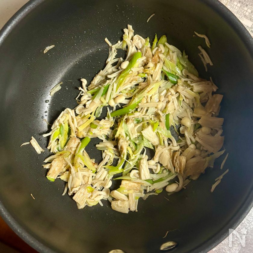 えのきだけを加えて中火にし、薄い焼き色がつくまでさらに3分ほど炒める。
