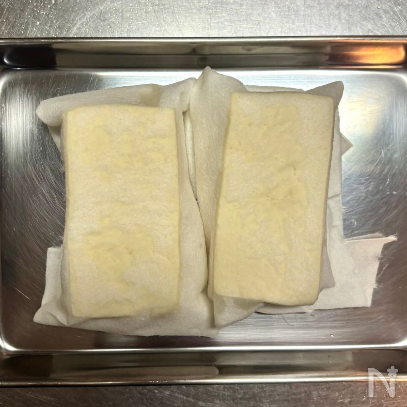 (1) 木綿豆腐は半分に切り、クッキングペーパーに1切れずつ包んで水きりをする。