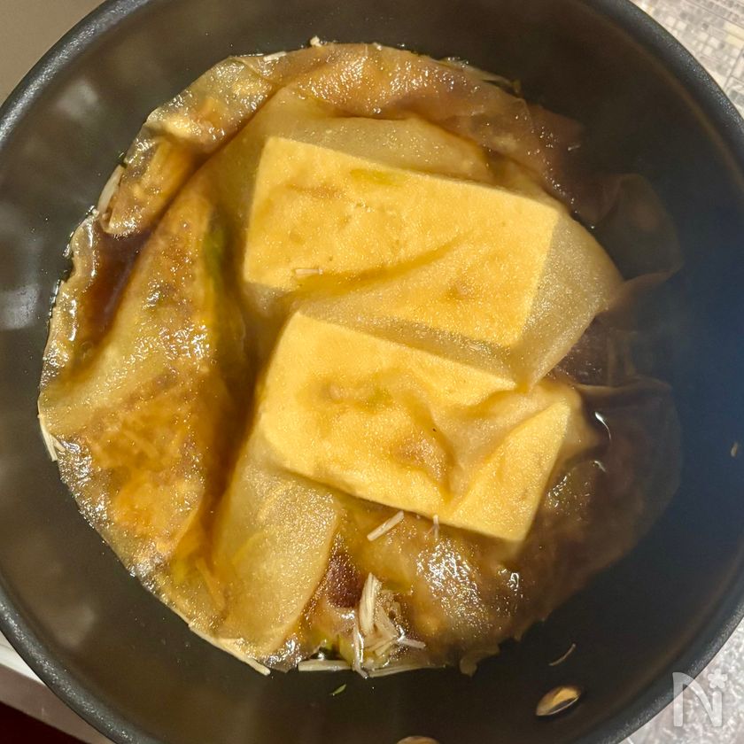 煮立ったら①のクッキングペーパー(1枚)の水気を軽く絞り、落としぶたのように豆腐にかぶせ、弱火で5分ほど煮る。