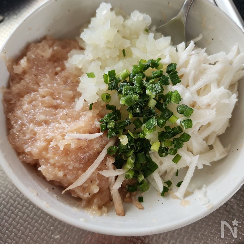 皮をむいて千切りにしたながいもと刻みねぎも混ぜ合わせて、つくねの生地を作る。