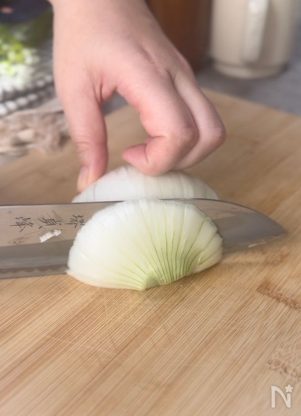 (1) 玉ねぎは皮をむき半分に切って、さらに4等分に切る(1.5~2cm程度の厚さに切る)