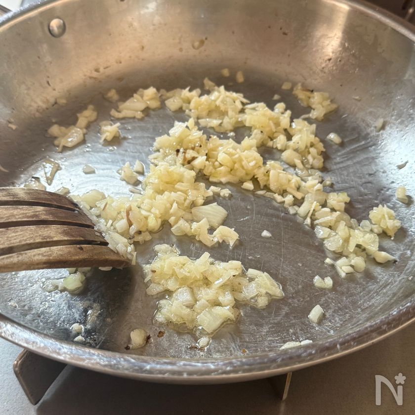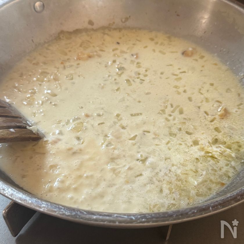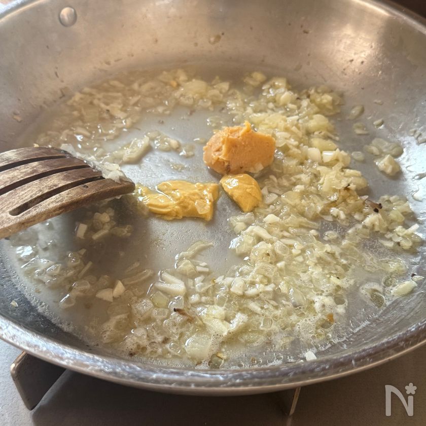 (4) 白ワイン、パスタのゆで汁大さじ1を加え、白味噌を加えて煮汁で味噌を煮溶かす。
