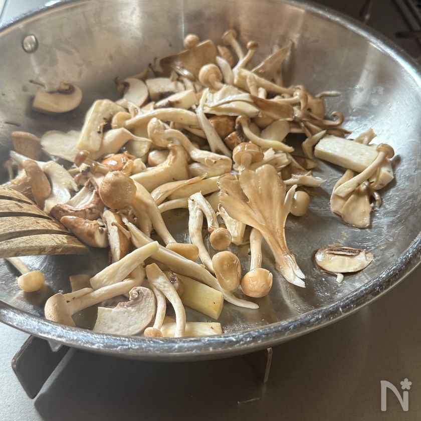 (2) フライパンにオリーブオイルを熱し、きのこ、塩を入れて5分、できれば7-8分炒める。