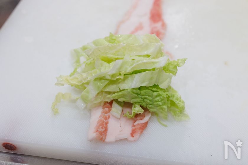 豚肉薄切りに白菜(1/12量)をのせ、手前から少しきつめに巻く。同様に巻いたものを計12個作る。