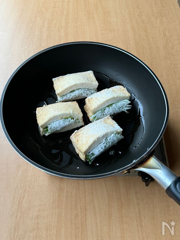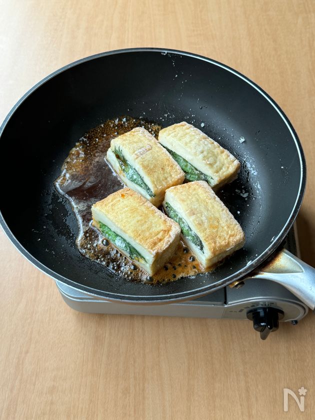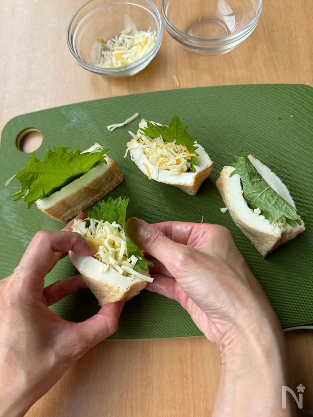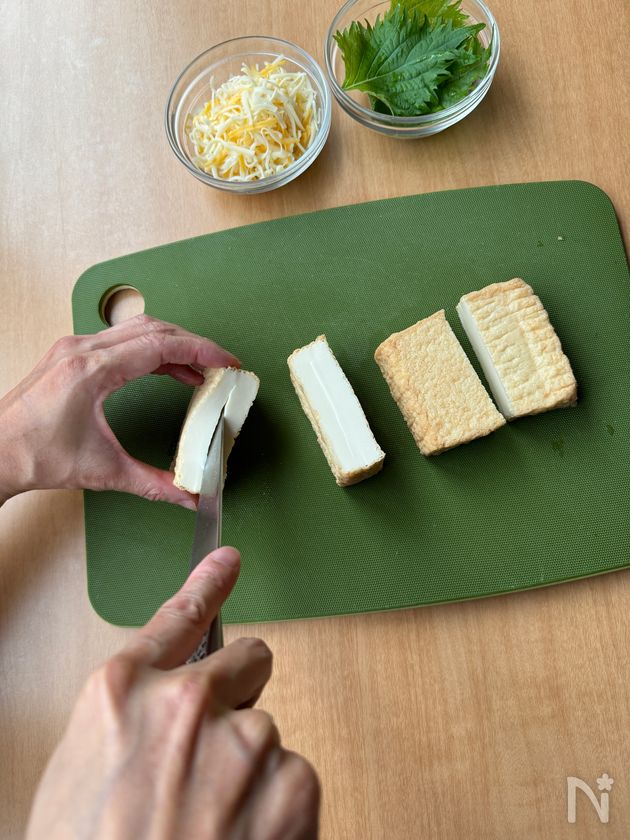 ■厚揚げの間にチーズを入れる時に青じそで蓋をするように包むとチーズが出にくくなります。