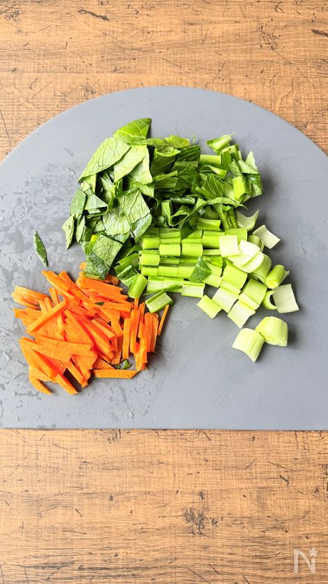 (1) 小松菜は1cm幅に、にんじんは短めの千切りにする。