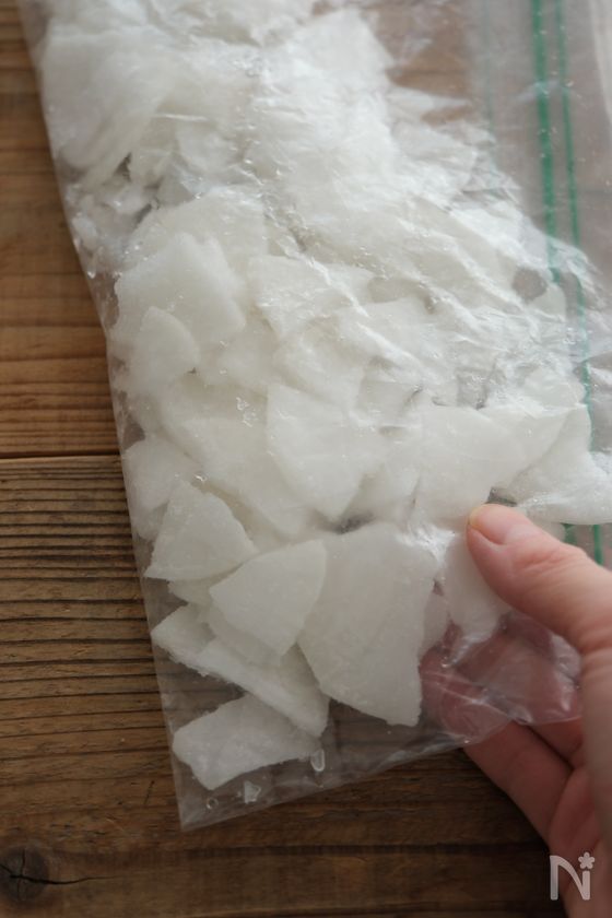 (下準備) 大根は皮をむいて極薄い輪切り(厚さ1〜2mm程)に切ったら、冷凍用保存袋にできるだけ重ならないように入れて冷凍しておく。使用する30分前に「できちゃうV冷凍」に設定しておく。