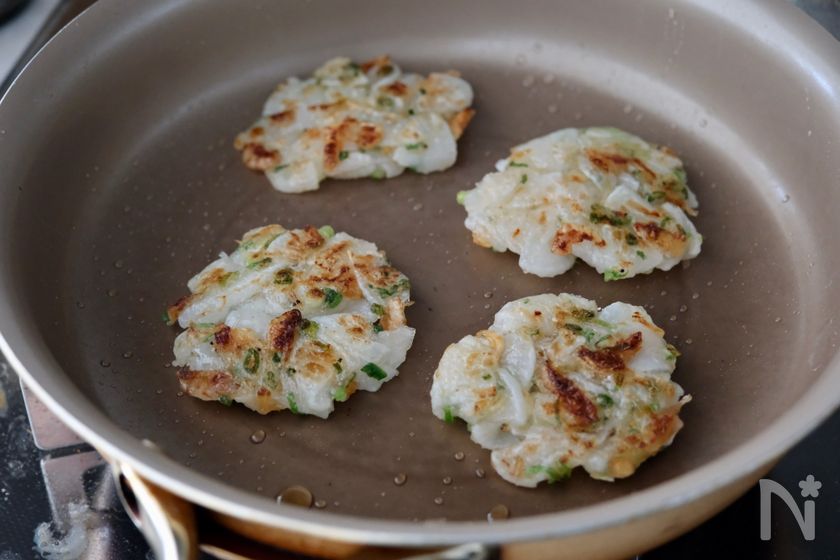 (3) フライパンにごま油を入れて中火で熱し、2を丸く平らにするようにして並べ、きれいな焼き色がつくまで5分程焼く。裏返してさらに2~3分焼いたら器に盛り、お好みで塩(分量外)を少々をふり、味を調える。