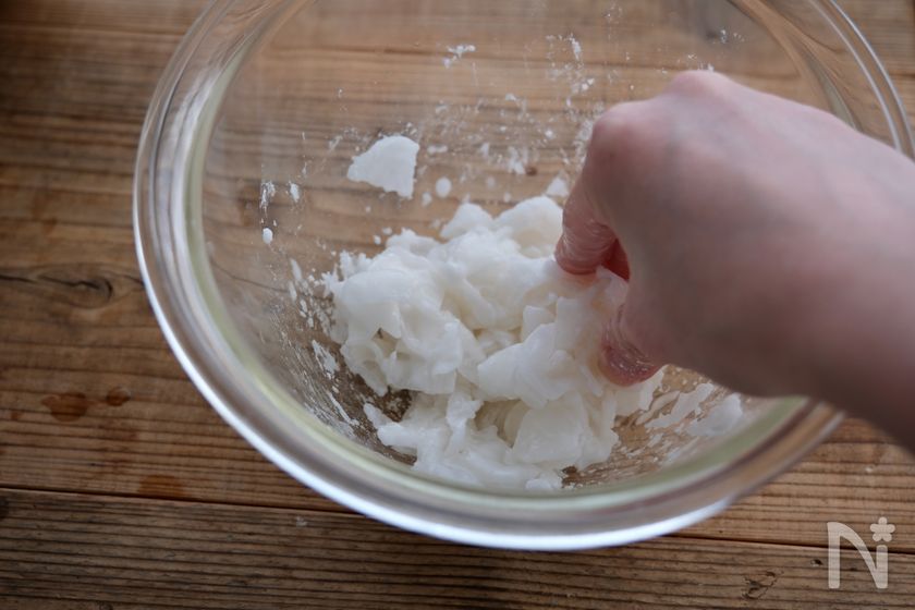 (2) 1に片栗粉と塩を加えて全体になじませるようにしっかりと混ぜる。桜えび、青ねぎ(きざみ)を加え、さらに混ぜ、4等分にする。
