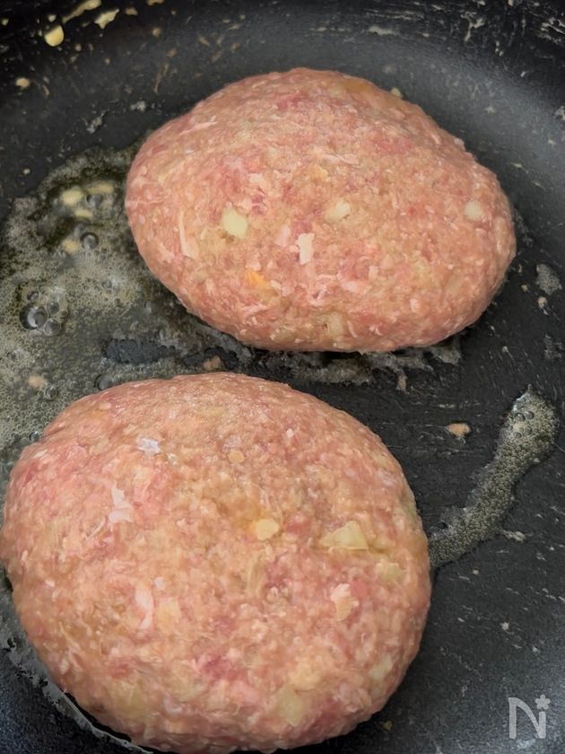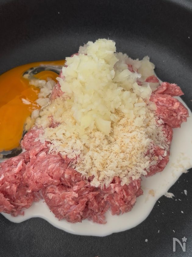 (1) フライパンに牛豚合挽き肉と塩を加えて粘り気が出るまでこねる。