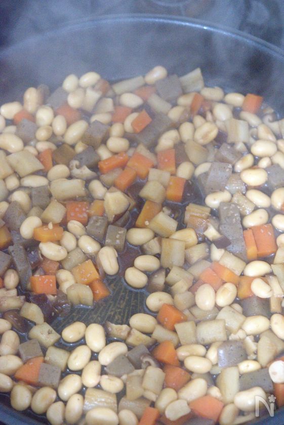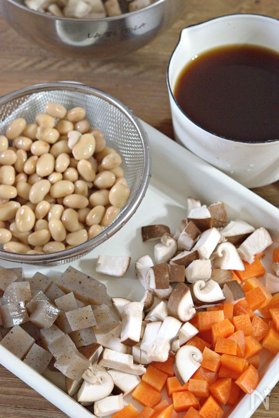 (2) 人参、椎茸、板こんにゃくも、ごぼうと同じ大きさに切る。大豆の水煮はザルに上げ、サッと洗って水気をきる。【A】を混ぜ合わせる。