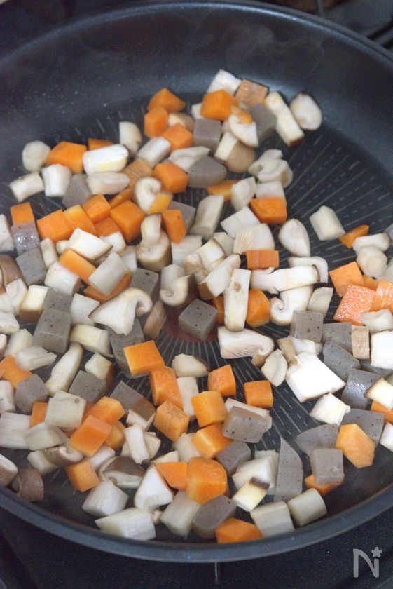 サラダ油、人参、ごぼう、椎茸を入れて2分炒める。