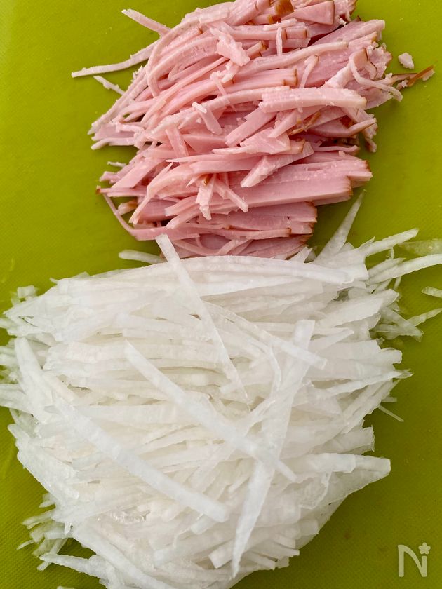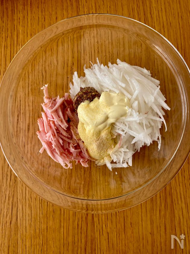 (1) ボウルに大根・ハム・【A】を加えてよく混ぜる。