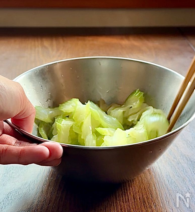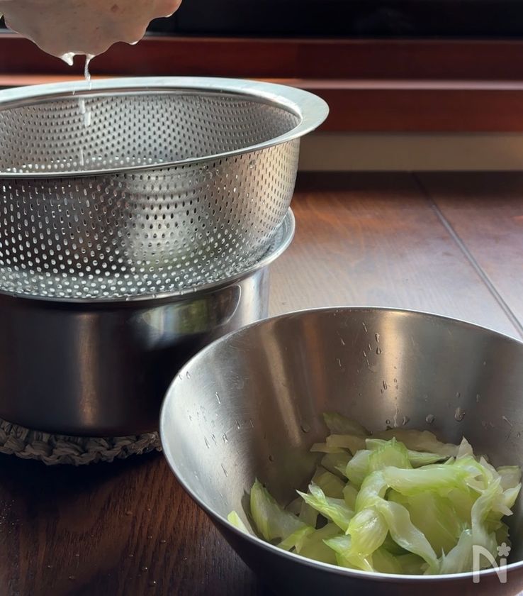 (3) 2をザルにあけ、粗熱が取れたら水気をしっかり絞る。