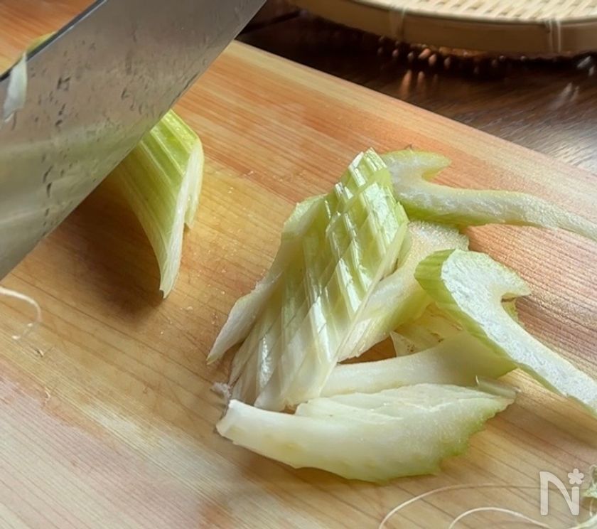 (1) セロリは筋を取り、斜めに約2mm幅の細切りにする。