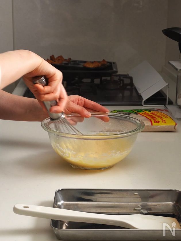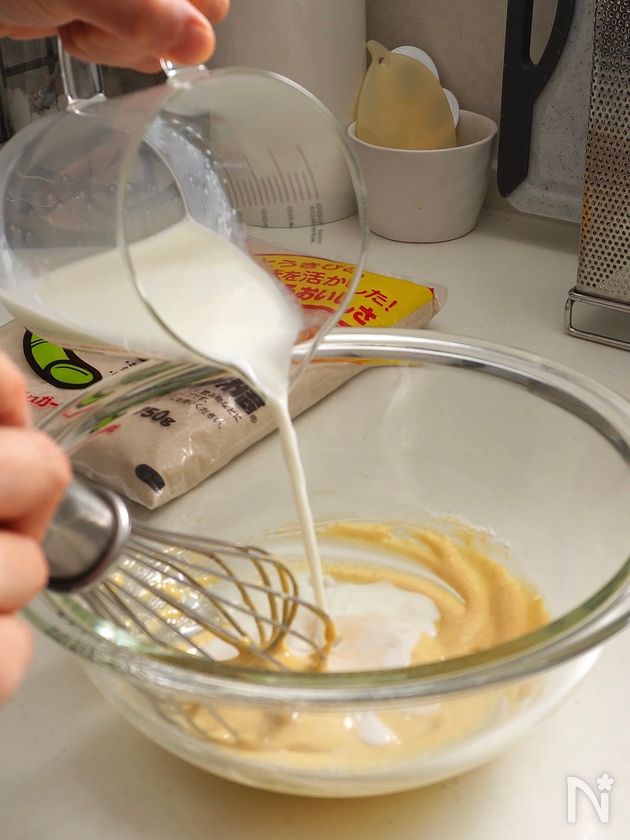 (3) 人肌程度に温めた牛乳を2回に分けて加え、都度混ぜる。