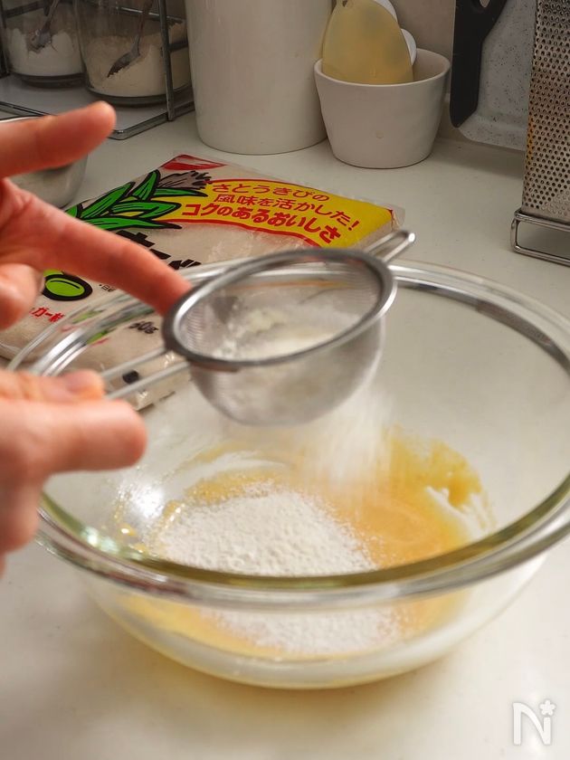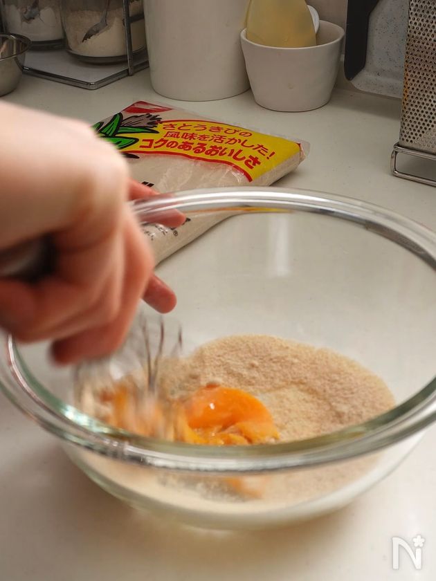 (1) ボウルに卵黄ときび砂糖を入れ、すり混ぜる。