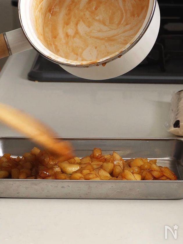 (8) 鍋に【A】を入れ、弱めの中火で出てきた水分を飛ばすように混ぜながら煮詰める。