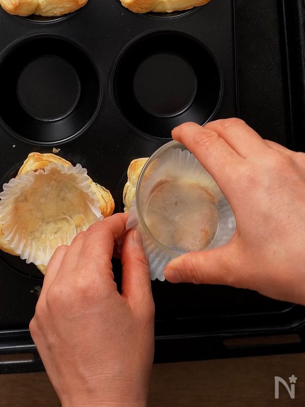 (6) 冷凍パイシートは4等分に切りマフィン型に敷き、フォークで数か所穴をあける。