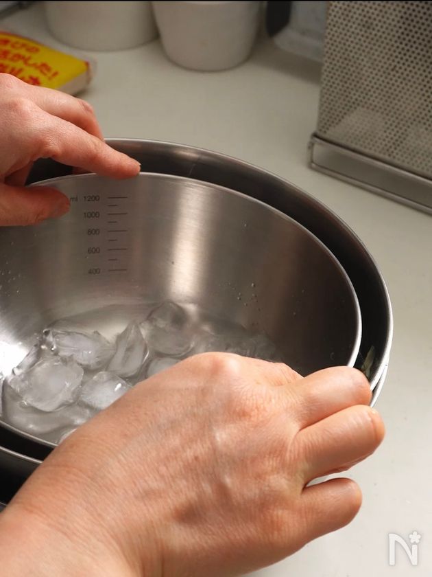 氷水(分量外)を入れたボウルで上下からしっかりと冷やす。